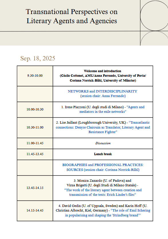 Il Workshop internazionale dedicato a Transnational Perspectives on Literary Agents e Agencies (Aix-en-Provence, 18-19 settembre 2025) dà voce al progetto “Caro Linder” in un contesto internazionale. Con un intervento su The work of the literary agent between creation and transmission of the texts: Erich Linder’s files, Virna Brigatti e Monica Zanardo dialogano con studiose e studiosi che in Italia, Francia, Germania, Inghilterra, Svezia e Stati Uniti studiano il ruolo e la funzione di agenti e agenzie letterarie da fine Ottocento ad oggi.